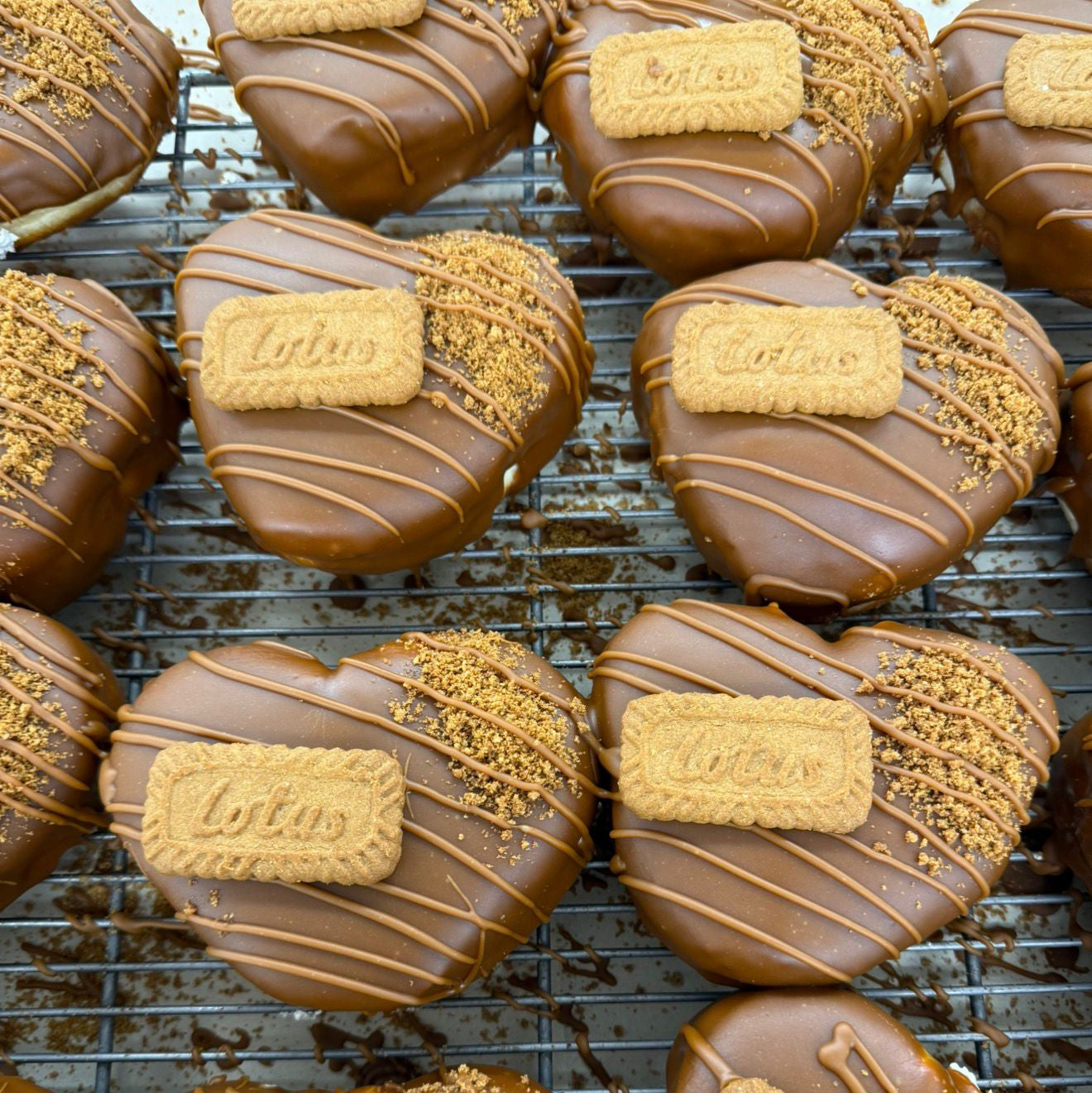Each soft, fluffy heart shaped donut is filled with rich whipped Biscoff vegan cream, topped with a layer of smooth vanilla Biscoff fudge, white vanilla icing, and a generous sprinkle of Biscoff biscuit crumb. Finished with a classic Biscoff biscuit on top, it's a vegan-friendly donut packed with sweet, spiced perfection.