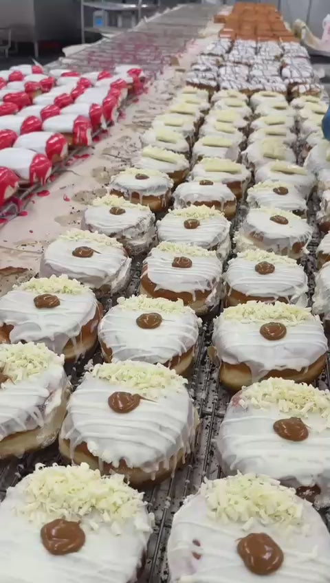 Milkybar Filled Donut: White chocolate lovers, this one's for you. Filled with silky white choc cream, dipped in melted white chocolate, and topped with crunchy Milkybar pieces + caramel drizzle. It’s creamy, dreamy, and straight-up irresistible. Vegetarian-friendly and dangerously good. 🤍🍯🍫